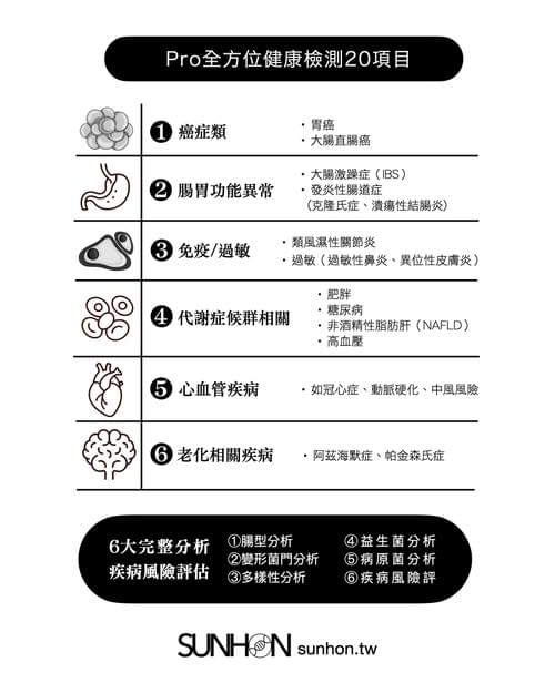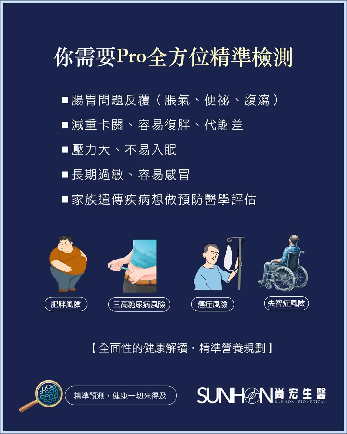 Pro 全方位套組=核心健康18項+帕金森氏症+阿茲海默症數量即將發布—— 聯絡我們